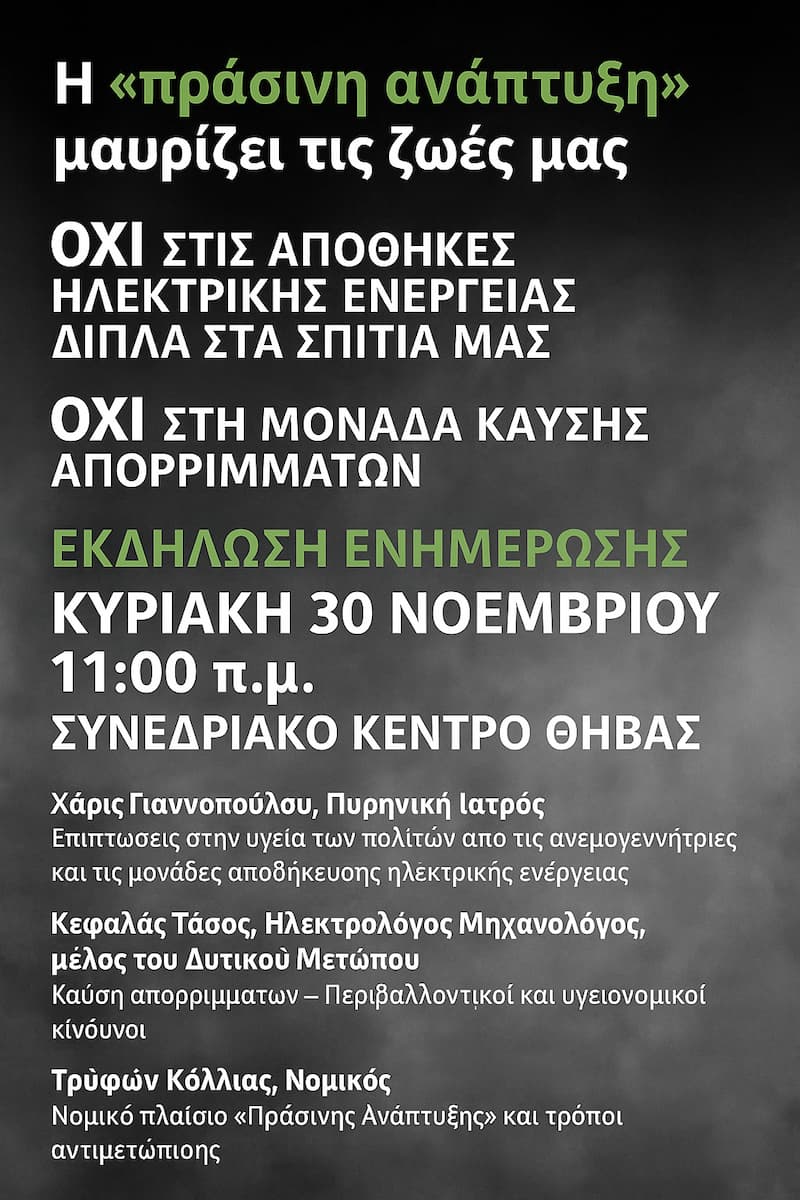 Ενημερωτική Εκδήλωση στη Θήβα: «Η πράσινη ανάπτυξη μαυρίζει τις ζωές μας»
