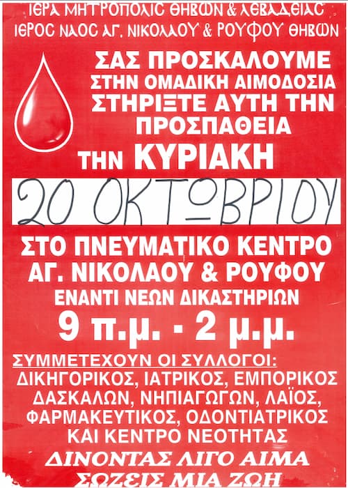 Την Κυριακή 20 Οκτωβρίου 2024 , από τις 9.30 το πρωί μέχρι τις 2.00 το μεσημέρι , οργανώνεται αιμοδοσία στην αίθουσα τελετών του Ιερού Ναού του Αγίου Νικολάου Θήβας (απέναντι από τα δικαστήρια).