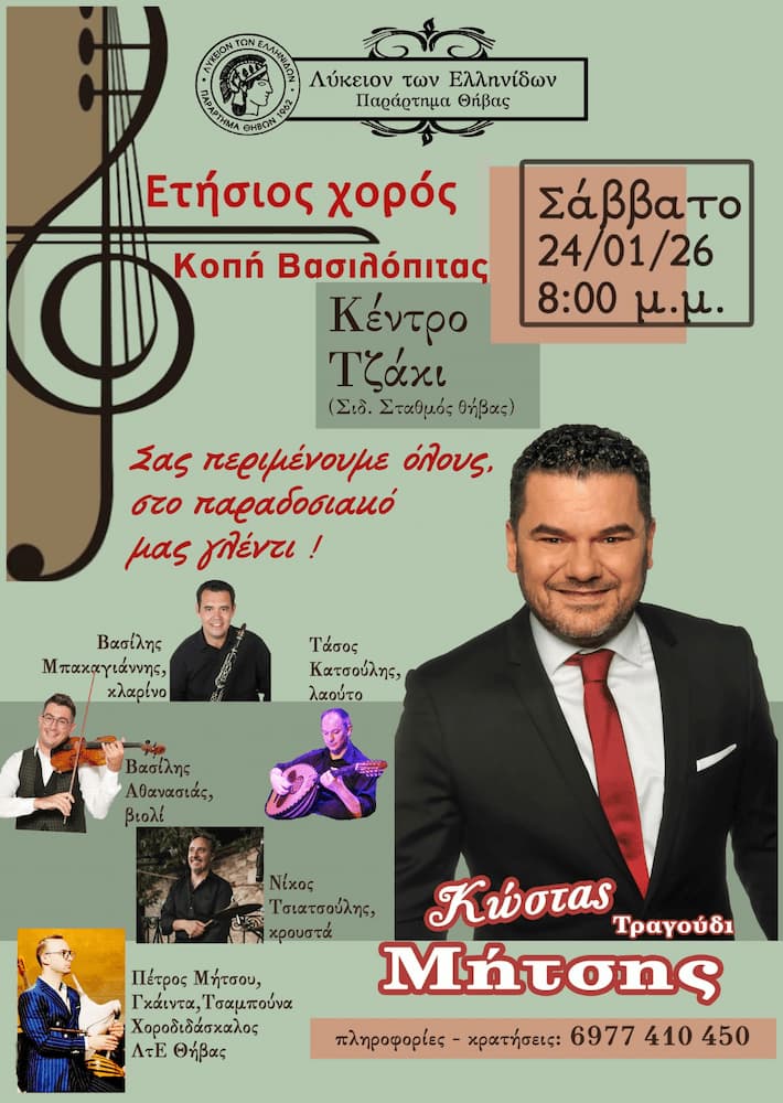 Τον ετήσιο χορό και την κοπή της πρωτοχρονιάτικης βασιλόπιτας διοργανώνει το Λύκειον των Ελληνίδων – Παράρτημα Θήβας, το Σάββατο 24 Ιανουαρίου 2026, στις 20:00, στο Κέντρο «Τζάκι» (Σιδ. Σταθμός Θήβας).