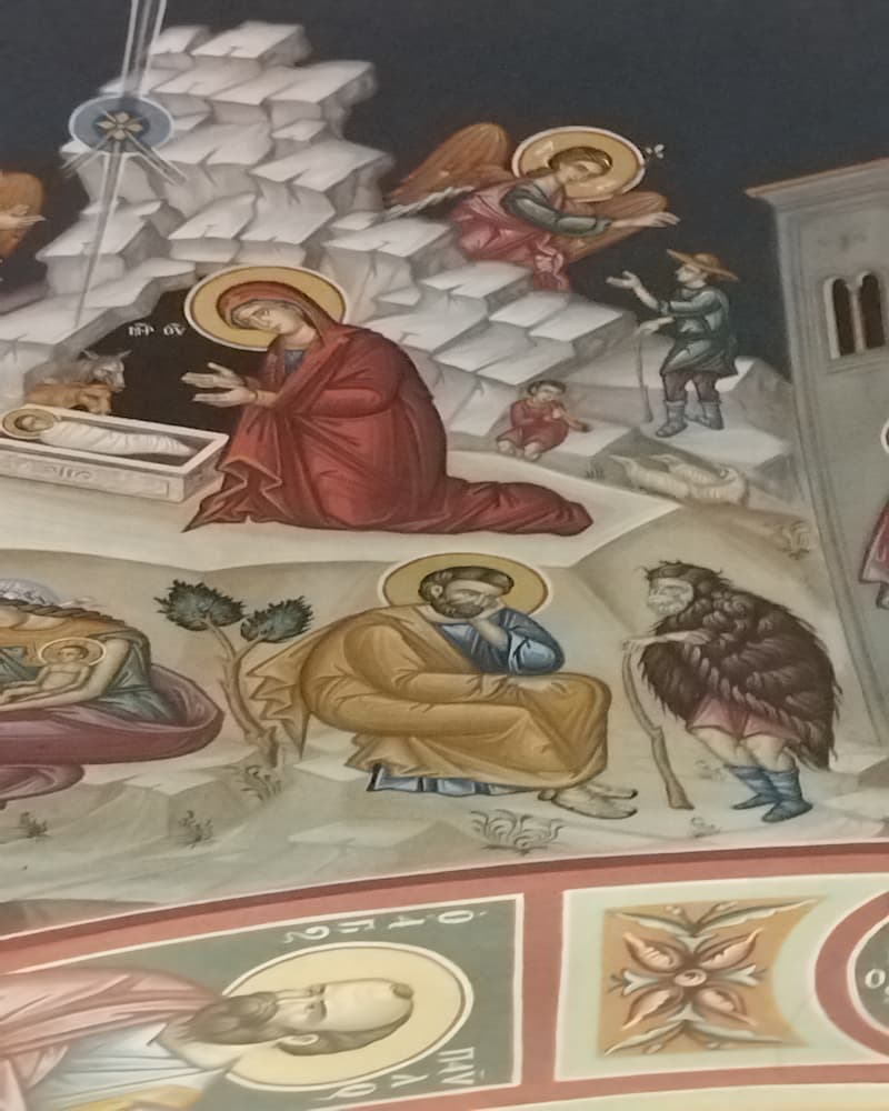 Στη μέση διακρίνουμε την Παναγία μας σε στάση παρακλήσεως προς το θείο Βρέφος στη φάτνη της Βηθλεέμ. Διακρίνουμε τους ποιμένες που μετά Αγγέλων δοξολογούσι, τους Μάγους που μετά αστέρος οδοιπορούσι.