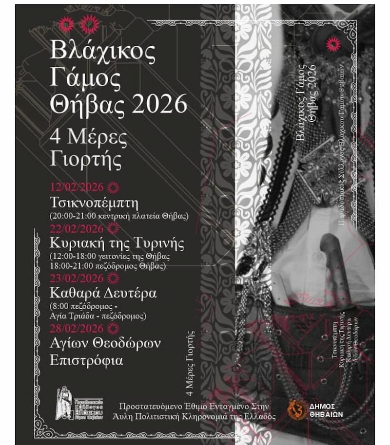 Ο Δήμος Θηβαίων προσκαλεί κατοίκους και επισκέπτες στον Βλάχικο Γάμο Θήβας 2026, ένα από τα σημαντικότερα και πιο αυθεντικά παραδοσιακά δρώμενα της Ελλάδας, που φέτος θα διαρκέσει τέσσερις ημέρες, γεμάτες έθιμα, μουσική, χορό και λαϊκή παράδοση.